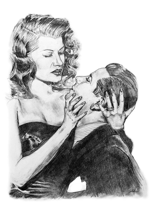 An 8"x10" art print of Rita Hayworth and Glenn Ford from "Gilda" with the original drawing done in graphite. To me, Rita epitomizes her "love goddess" persona in this movie. She is stunning, with her glamorous outfits and sensuous songs. This promo shot of the two lovebirds is just killer, as Rita in her iconic gown, tempts Glenn with possibly a sultry kiss. This artwork is printed on archival matte paper.