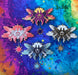 The pin is jumbo-sized, at about 3 inches (7.6 cm) wide. It has two pinbacks with rubber clutches, hard enamel and a removable dangle charm.