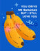 one banana greeting card illustrating a banana on dark blue background with the phrase “you drive me bananas but i still love you”