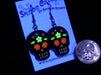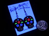 Going to an evening Dia De Los Muertos event? These cheerful calaveras won't hide in the darkness, as they will glow for up to an hour. Choose blue or orange eye designs. Laser-cut black acrylic with hand-painted glow designs, 1-1/8-inch high. USA-made surgical stainless posts.