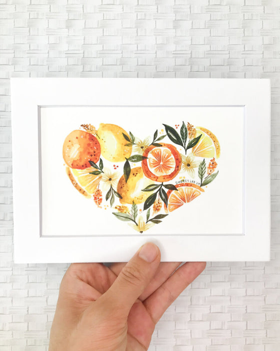 Watercolor heart filled with lovely oranges and lemons painted by Sherry. 4x6 print comes with a 5x7 white mat frame and printed on 16-17pt cardstock with matte coating - D022