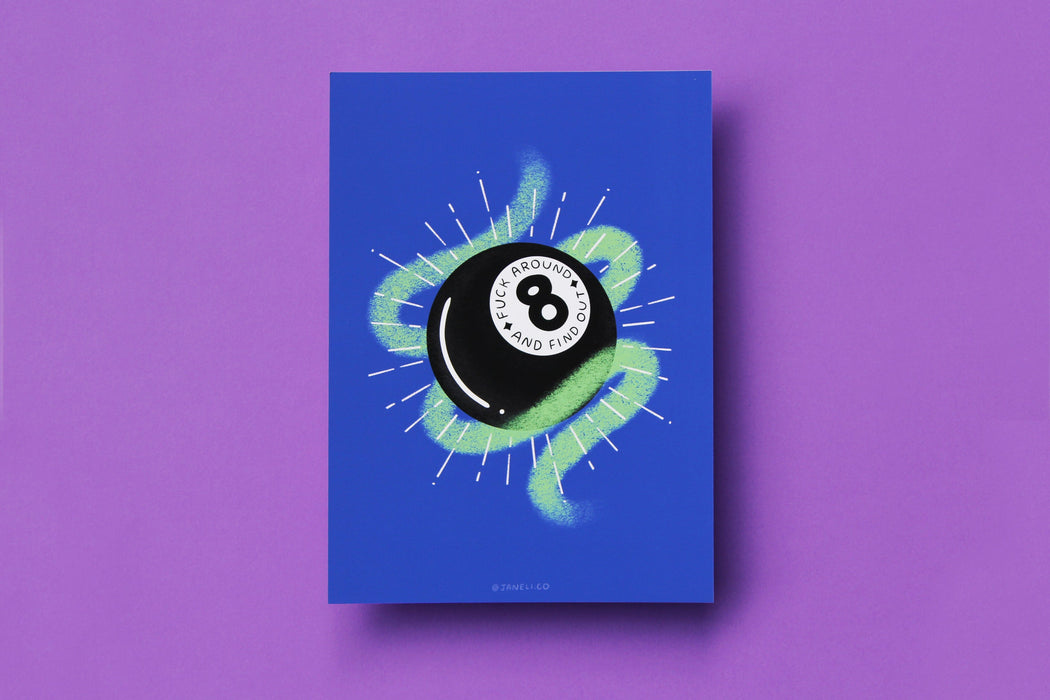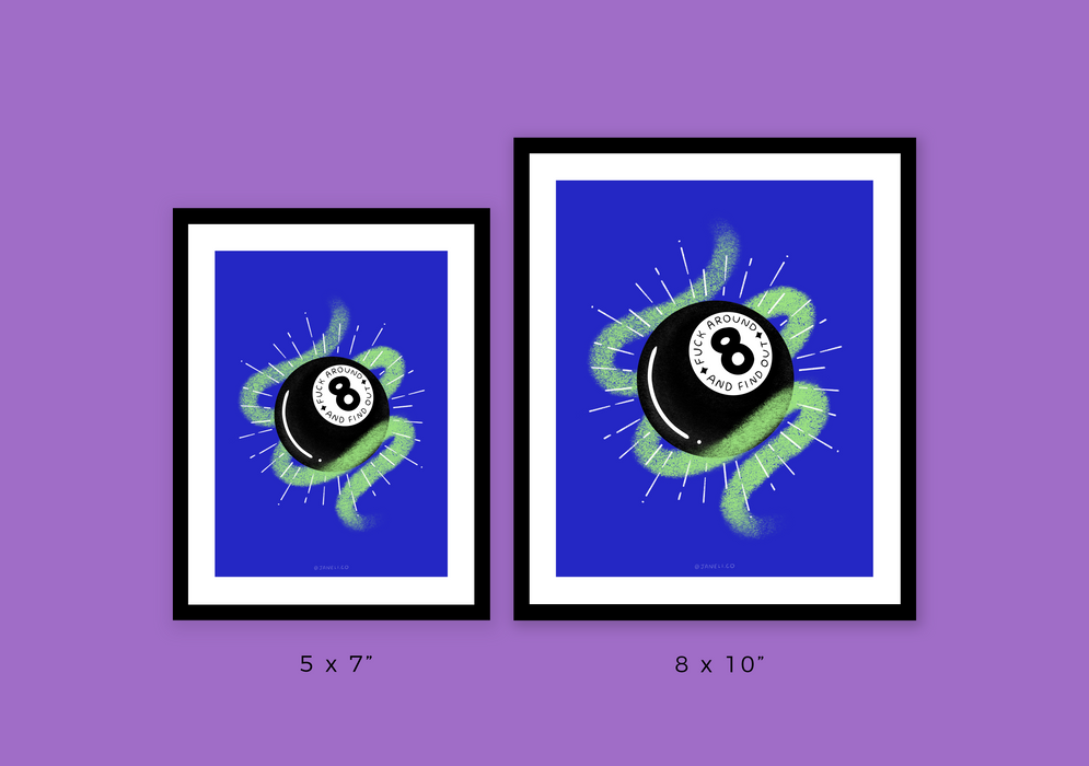 Have an important life decision to make? Just ask the magic 8 ball and you will receive your thoughtful answer: Fuck around and find out! Remind yourself and everyone around you that you should just fuck around and find out in life with this art print.