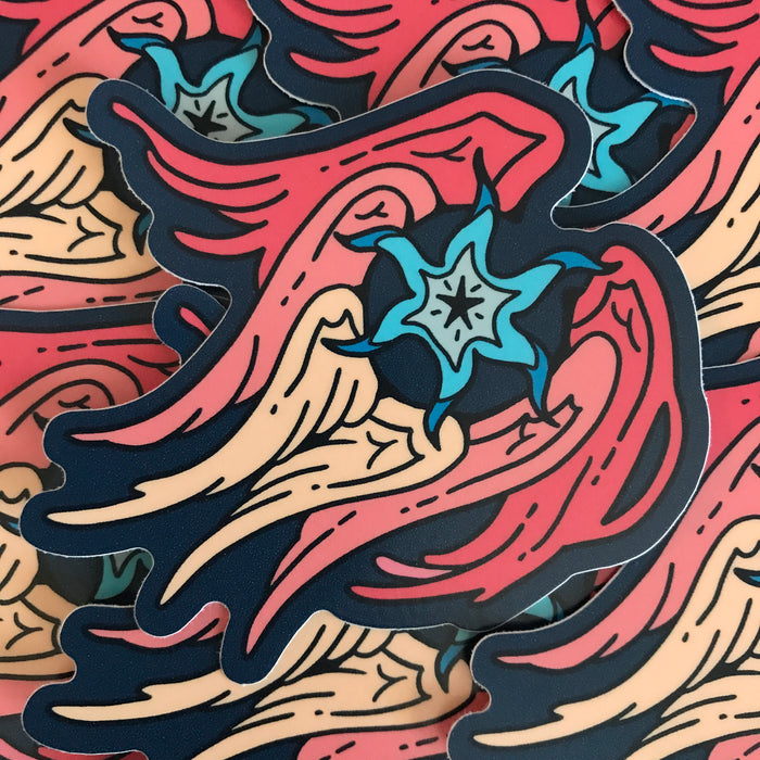 This sticker is approximately 3 inches (7.6 cm) on the longest side, and printed on matte vinyl.