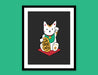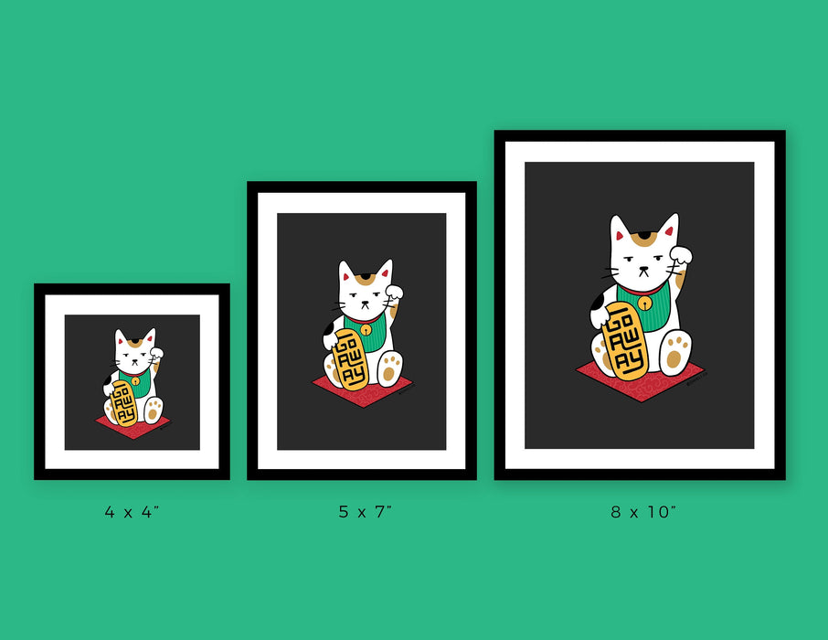 An art print featuring a traditional Maneki Neko with a nontraditional, but realistic announcement.