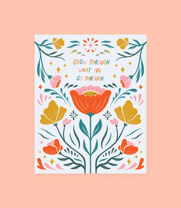 This print features a collection of cheerful florals and patterns. The text reads "Grow through what you go through."