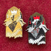 These pins are approximately 2 inches long; with two pin posts with rubber clutches, and hard enamel. They are available in black nickel or gold plating.