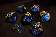 Featuring gold flakes scattered across shimmering cobalt and inky black skies, this sharp edged dice set was hand-poured, sanded, polished, and inked with white numbers. 7 pieces are included, one each of the d4, d6, d8, d10, d12, d%, and d20. As with all handmade dice, they are one of a kind, and may contain imperfections such as small indents, fine scratches, shifted numbers, or tiny bubbles created during the resin casting and polishing process.