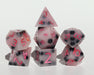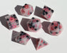 Featuring miniature boba pearls and strawberries suspended in a milky pink, this sharp edged dice set was hand-poured, sanded, polished, and inked with ombre pink numbers. 7 pieces are included, one each of the d4, d6, d8, d10, d12, d%, and d20. As with all handmade dice, they are one of a kind, and may contain imperfections such as small indents, fine scratches, shifted numbers, or tiny bubbles created during the resin casting and polishing process.