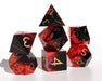 Featuring inky black swirls overtaking ruby red depths, with flashes of rainbow mylar bits, this sharp edged dice set was hand-poured, sanded, polished, and inked with gold numbers. 7 pieces are included, one each of the d4, d6, d8, d10, d12, d%, and d20. As with all handmade dice, they are one of a kind, and may contain imperfections such as small indents, fine scratches, shifted numbers, or tiny bubbles created during the resin casting and polishing process.