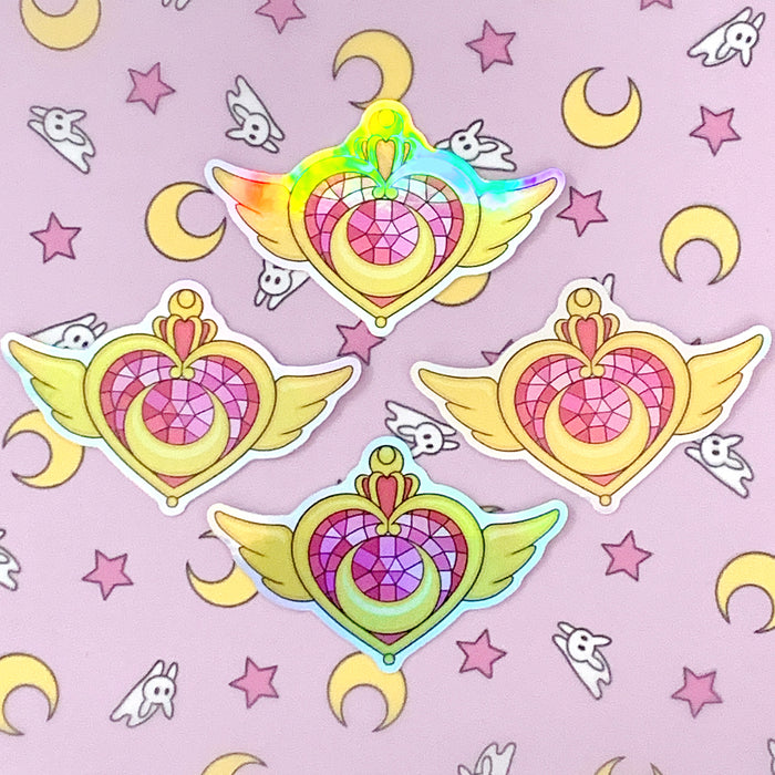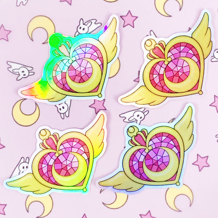 These sailor moon decals have a holographic glossy finish with an iridescence shine. They're perfect for indoor or outdoor use and have a protective laminate and are durable, waterproof, and resistant to sunlight. Size: 3" x 2"
