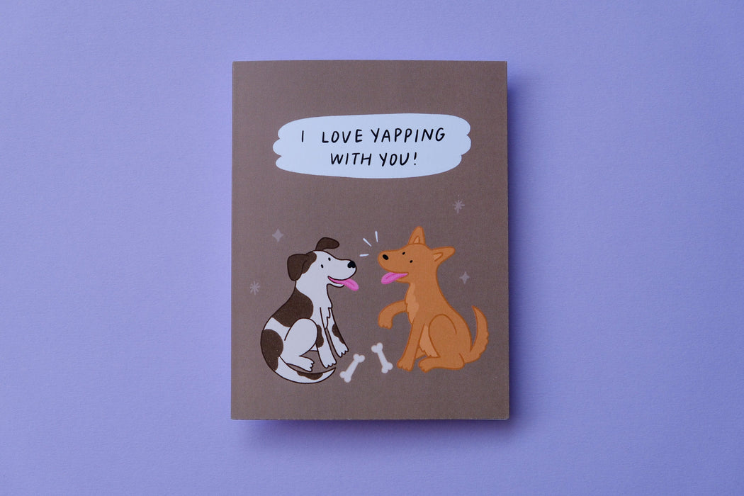 Are you really friends if you don't yap together? Celebrate the joy of friendship with this adorable card that says "I Love Yapping with You!" Featuring two pups having a little gossip session, this card is perfect for your friend who loves to spill the tea as much as they love hearing all your life updates. Send this card as a reminder that you love catching up with them, chatting for hours, and dishing out juicy goss together.