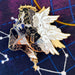 This pin is 2.3 inches (7.6 cm) wide, with gold plating, hard enamel, recessed metal in the crown, and a dangle charm. It has two pin posts and rubber backings.