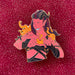 Karlach is 2 inches long with hard enamel, black nickel plating or gold plating with glitter accents. She has two pin posts with rubber backings.