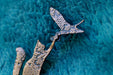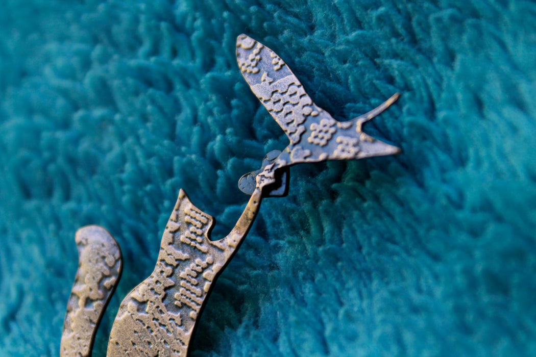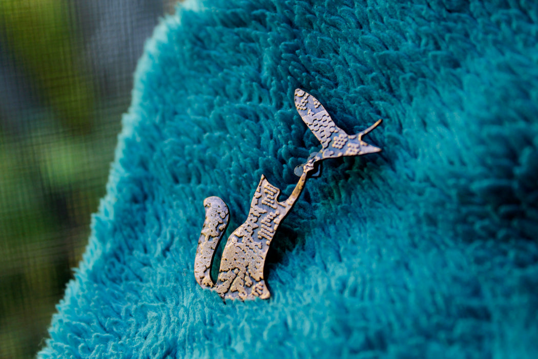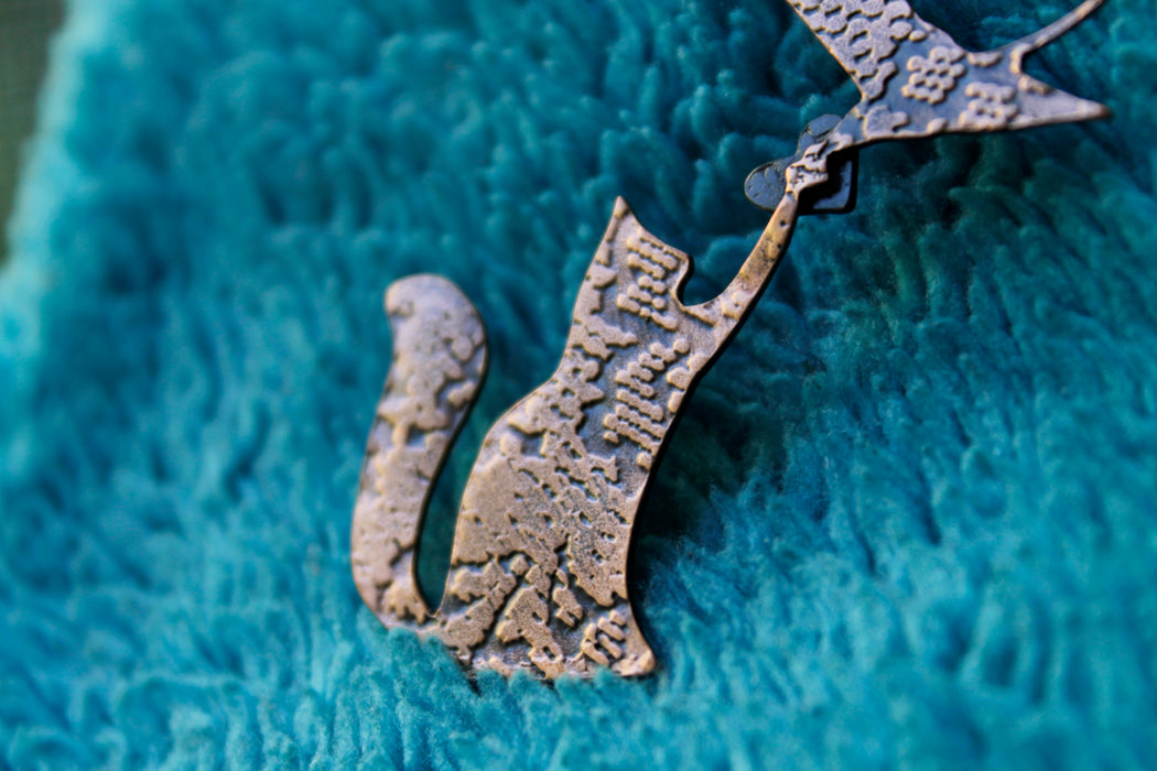 Acid-etched lace pattern on hand-sawed copper with liver-of-sulfur patina (two-pin attachment for stability).