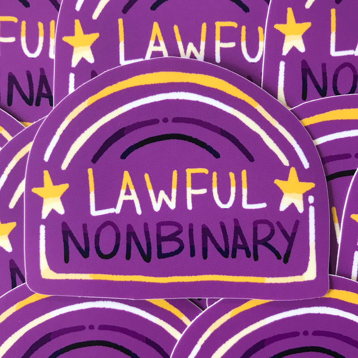 Each sticker is about 3 inches (7 cm) on the longest side and is printed on matte vinyl. You can pick between one or both of these stickers: a standard Lawful Nonbinary design, or a Nyanbinary design featuring a cat.