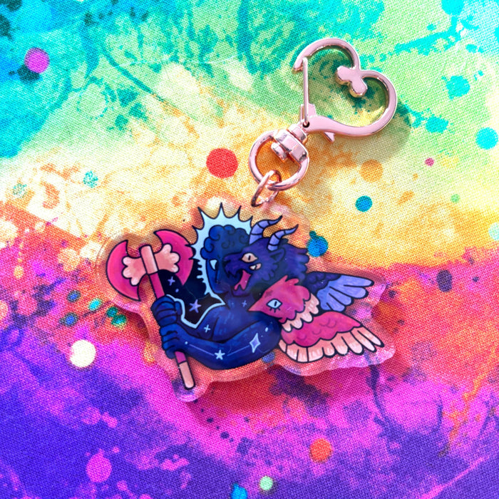 This acrylic keychain is 2.5 inches (6.3 cm) on the longest side, double-sided with the same print on both sides; it has a rose gold star clasp.