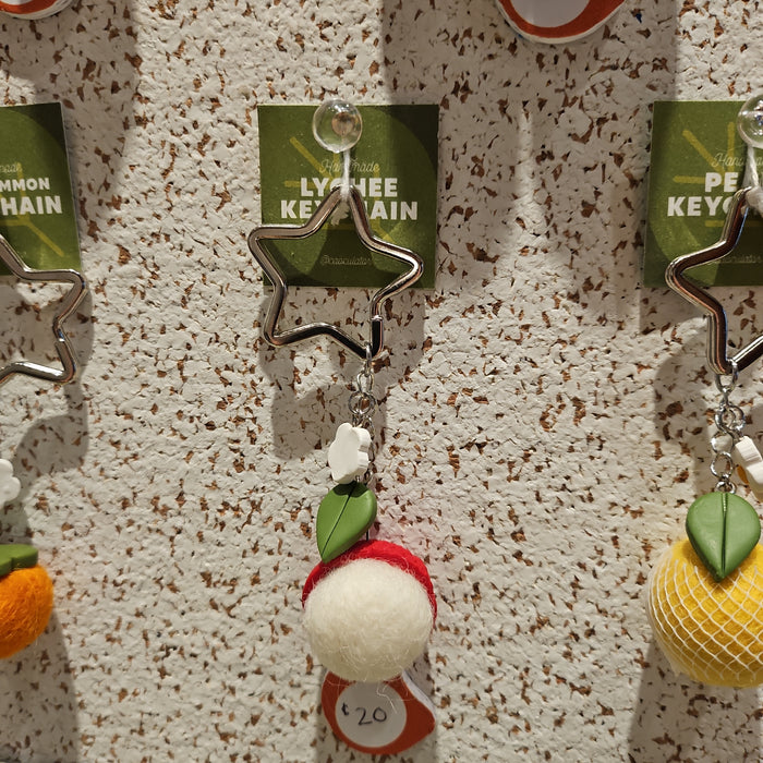 Click to expand Tap to zoom Lychee Keychain by Faith Cao Sold out $20.00 | / 1 2 3 4 5 6 7 8 9 10+ Quantity Quantity Sold out Lychee keychain with dangling daisy, leaf, and star keyring. Keychains are handmade with polymer clay and felt.