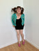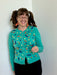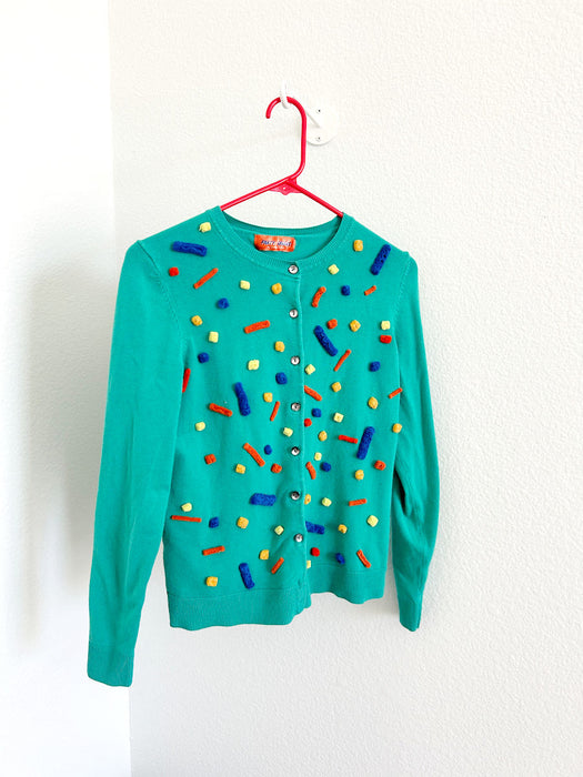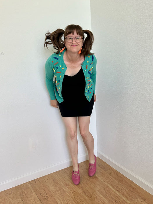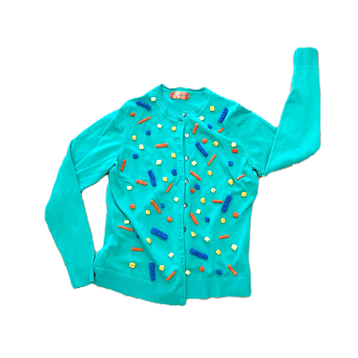 When I was little, I didn’t know what “Memphis Style” was, and I called stuff like this “Pee Wee Herman” style. Sweater is a lovely teal with orange, blue and yellow dots and dashes. It’s candy, it’s punctuation, it’s a secret code telling you “HAVE FUN!!!!’