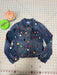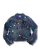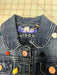 Mini jean jacket in size small for kids! Adorable jean jacket has rivets, side pockets and pompoms front and back.
