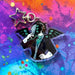 This acrylic keychain is 2.5 inches (6.3 cm) on the longest side, double-sided with the same print on both sides; it has a purple star clasp.