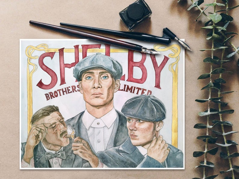 Peaky Blinders art print of an original watercolor painting. Thomas, Arthur, and John--all the Shelby brothers together. The original painting was with watercolor, pencil, and gold acrylic. This is such a well-made, authentic show, and I hoped to do it justice with an art nouveau twist.