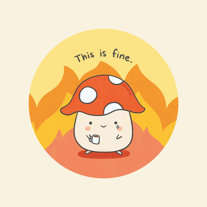 This sticker features a forlorn mushroom surrounded by flames, with a single tear dripping down its cheek. The text reads "This is fine."