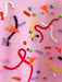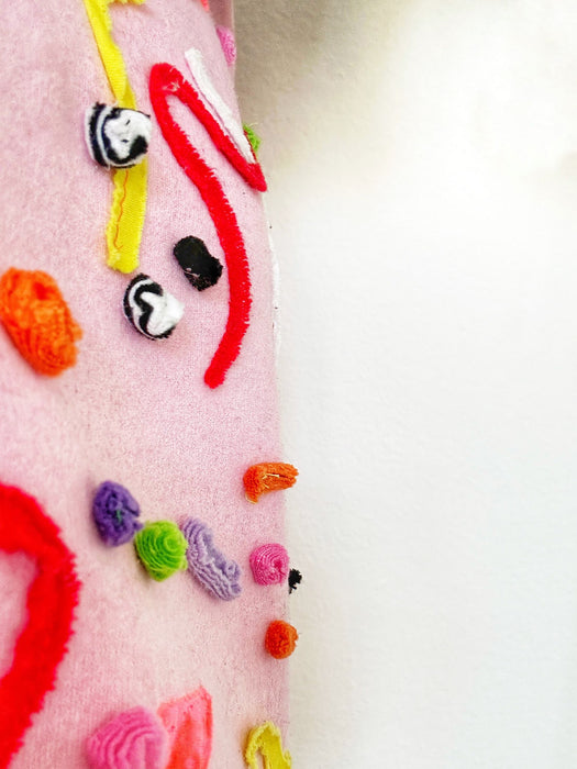 Party Savers to the rescue! Thrifted pink sweatshirt with an original fabric composition. Not just flat appliqués- this shirt is PUFFY! Ribbons, pompoms and patches create a jumbled color palette. These are the pencil shavings that result when your mind sharpens a great idea.