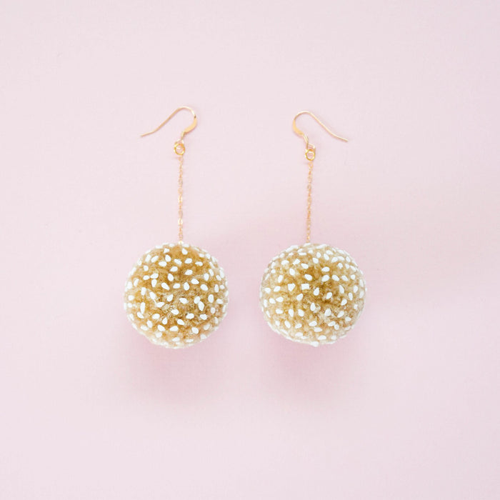 Each pair of sesame ball pom pom earrings is handmade, so the size and shape of the earrings, as well as the placement of the sesame seeds on each pom pom may differ.