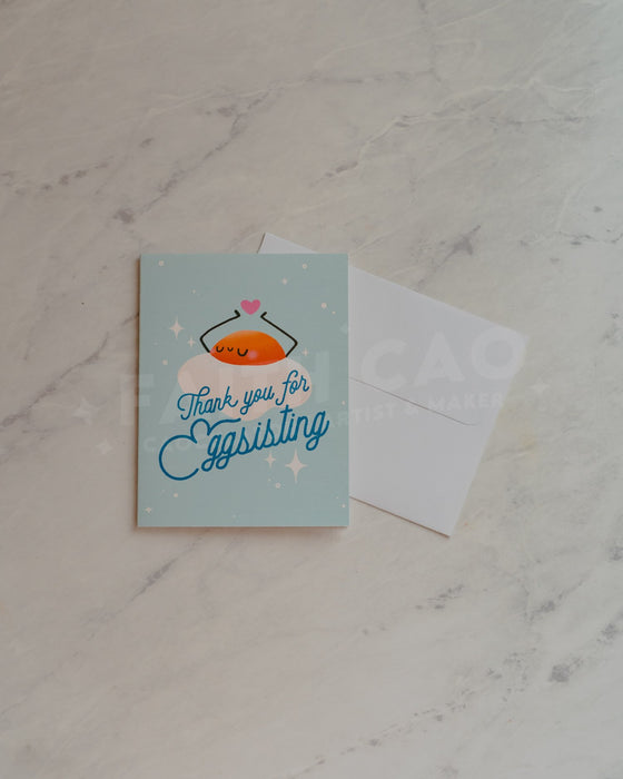 ONE EGGSISTING GREETING CARD ILLUSTRATING AN EGG HOLDING A HEART ON A BLUE BACKGROUND WITH THE PHRASE “THANK YOU FOR EGGSISTING”