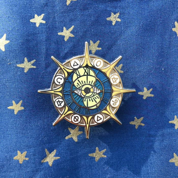 The pin is 1.8 inches (4.8 cm) wide. It has two pinbacks with rubber clutches, half-raised metal under transparent enamel, a hard enamel finish, and gold plating.