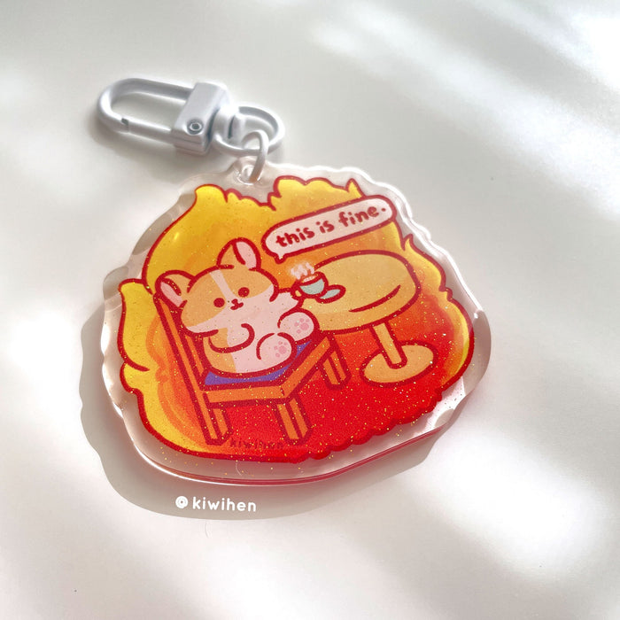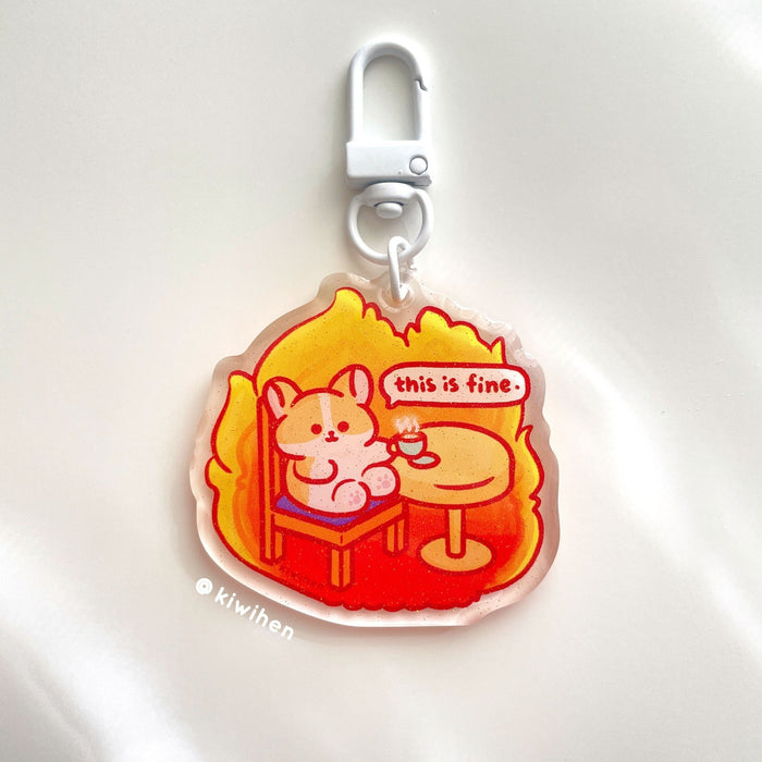 This listing is for 1 x This is Fine corgi acrylic charm Approximate Size: 2” (W) Material: Acrylic There is art printed on both sides. The front side has a shiny epoxy and the back side is plain acrylic. It has a cream color keychain clasp. The backside of the charm has a thin protective film stuck on it, it is to protect it from getting scratched during transportation. You can remove it and they charm will look clear and shiny.