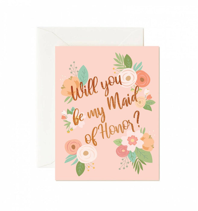 Want to formally invite your best friend to your bridal party as a Maid of Honor? Send this floral, pretty-in-pink Maid of Honor proposal card to your girlfriend!