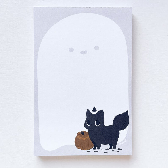Illustration features a black kitty adorned with a with hat and an elegant broom like tail. The kitty poses pretty next to a pumpkin and friendly ghost friend. You can write spooky notes on your new ghost friend's tummy :) ✿ NOT STICKY, it is tear-away sheets ✿ Size: 4" x 6" ✿ 50 Sheets ✿ Cardboard backing to retain structure